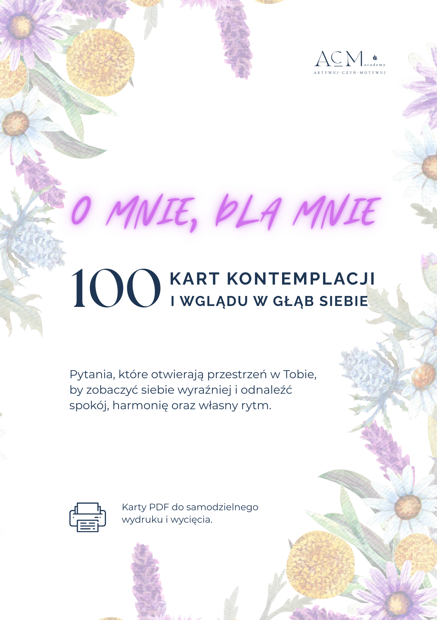 100 kart kontemplacji i wglądu w głąb siebie „O mnie, dla mnie” to 100 kart, które prowadzą Cię przez pytania pomagające lepiej zrozumieć siebie: swoje myśli, emocje, decyzje i schematy działania. Dzięki regularnej refleksji i zapisywaniu odkryć zaczynasz widzieć siebie wyraźniej, podejmować bardziej świadome wybory i żyć w większej zgodzie ze sobą.